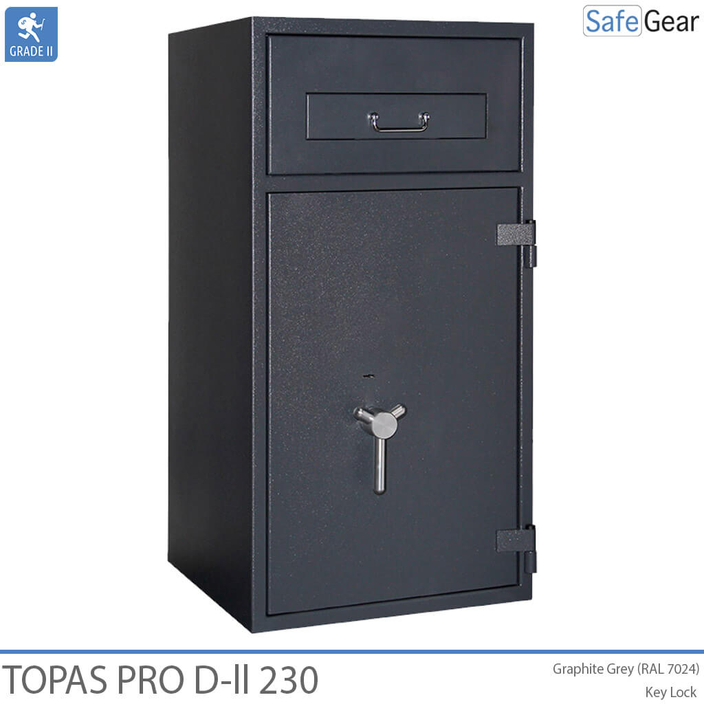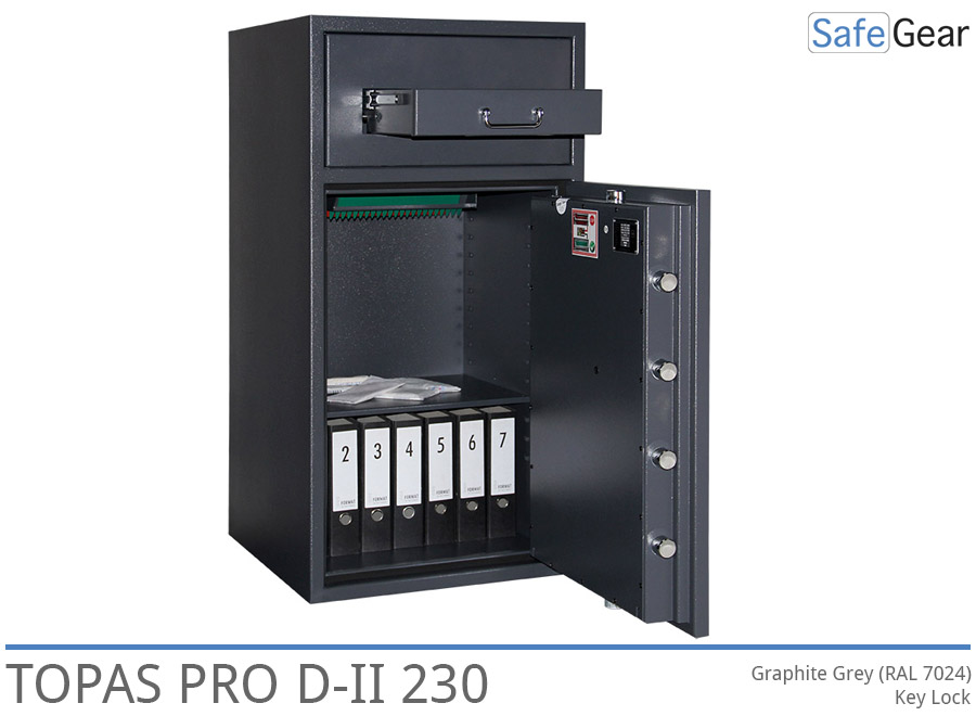 Topas Pro D-II ist ein Deposittresor ausgezeichnet in Klasse 2. Diese starke Widerstandsfähigkeit ermöglicht Ihnen ihre im Tresor gelagerten Wertsachen bei einem Versicherungsunternehmen zu versichern.